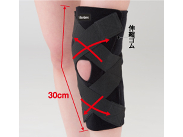 ・伸縮するクロスベルトが膝関節の圧迫と左右の動揺を防ぐ